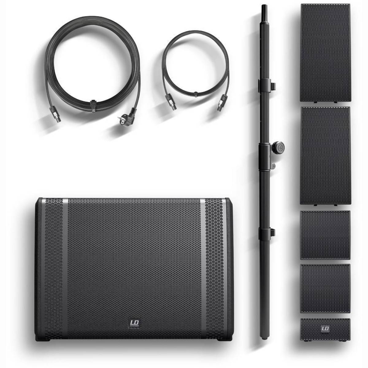 - 1 x aktiver Subwoofer