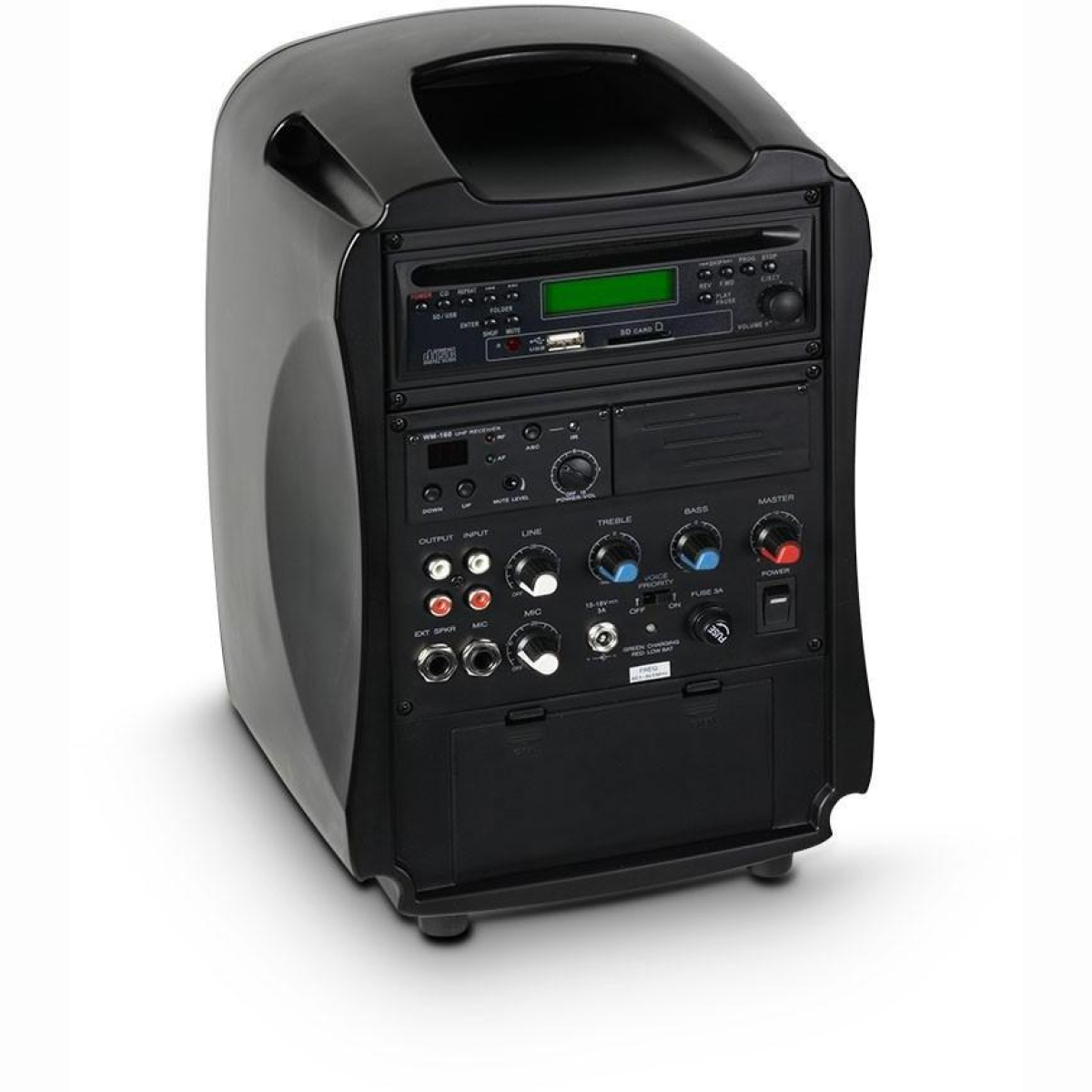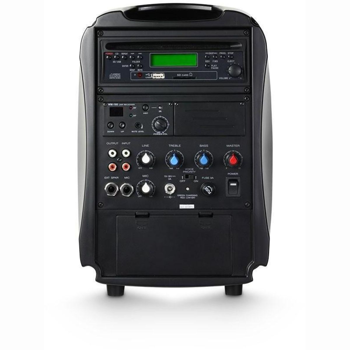 - Bedienelemente Bass , Line Gain , Master , Mic Gain , Power , Treble , Voice Priority On / Off
