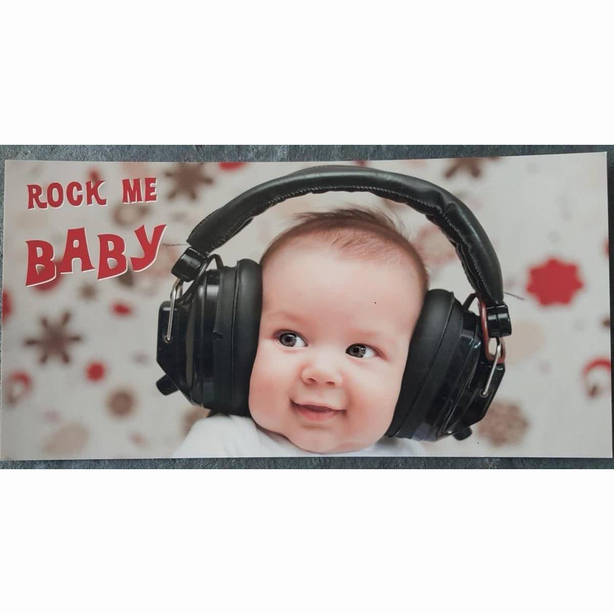 Rock me BABY - XXL Karte zeigt ein süßes entspanntes Baby mit XXL-Kopfhörer.
