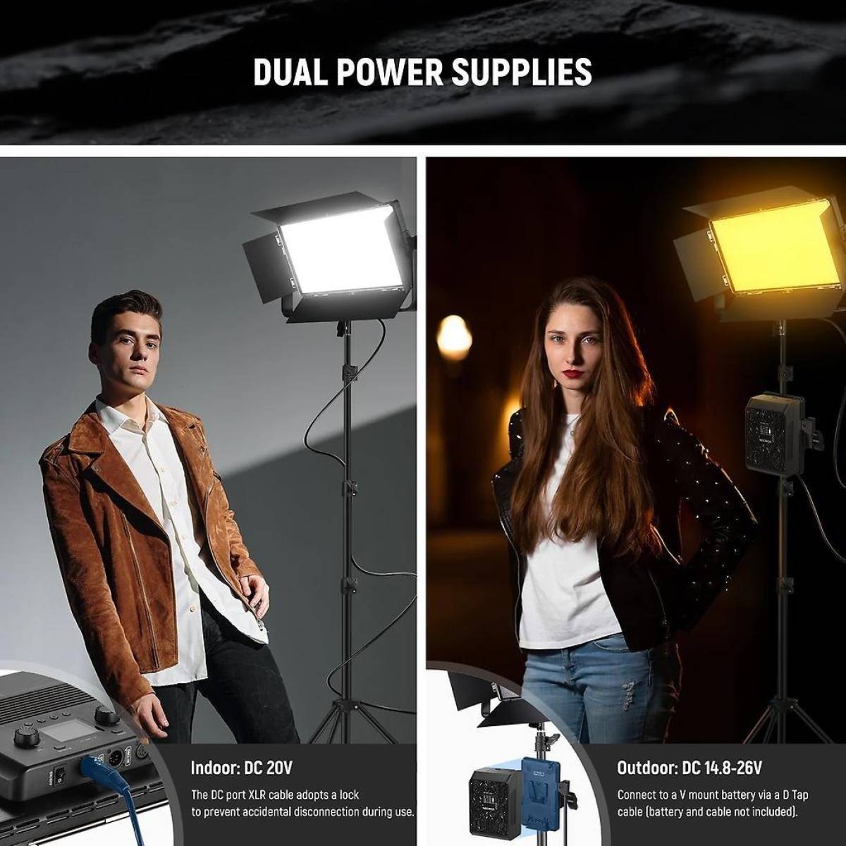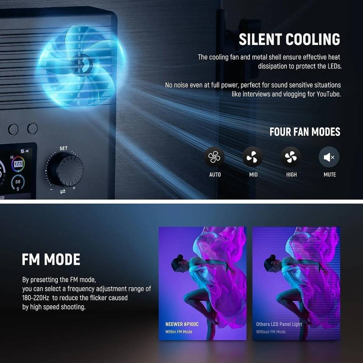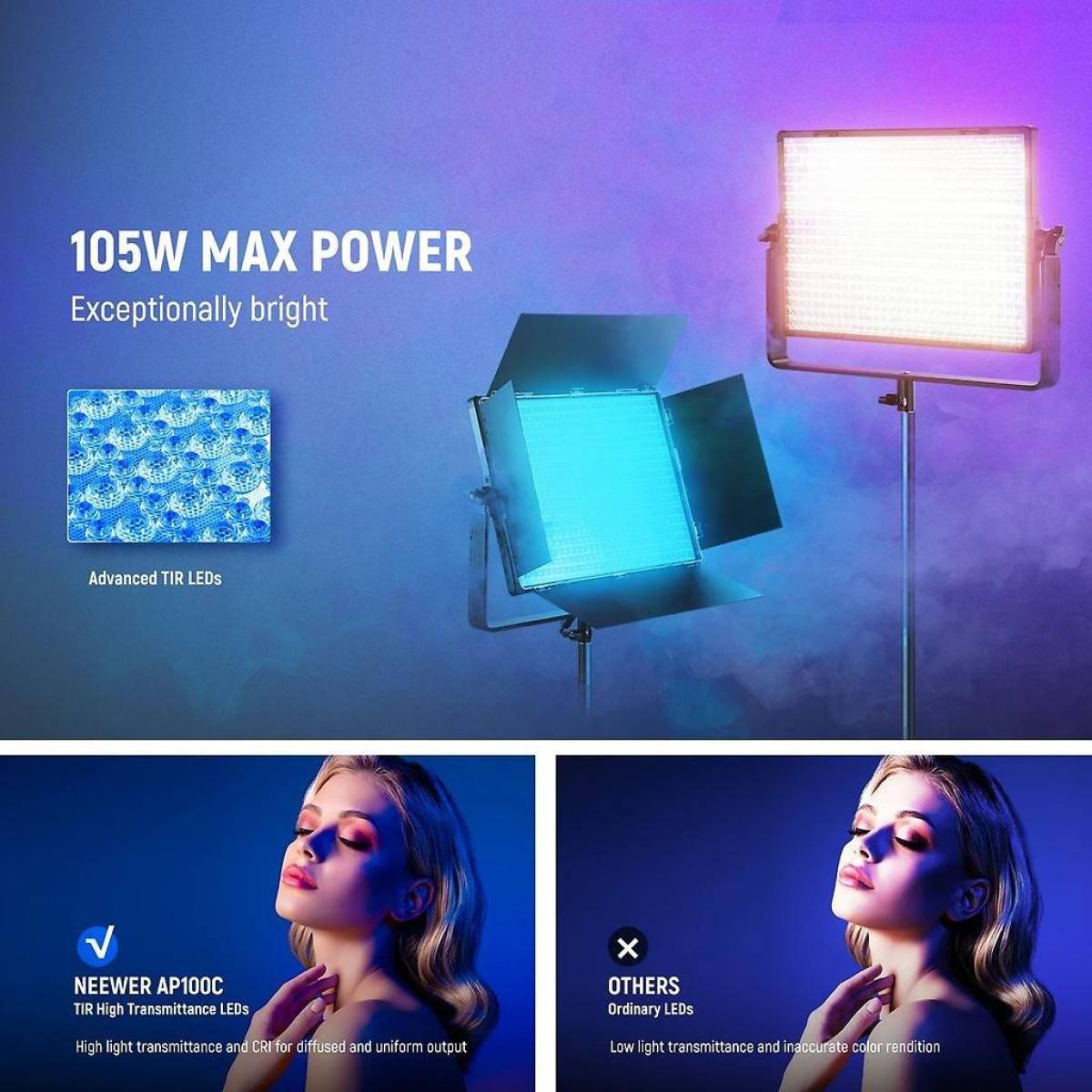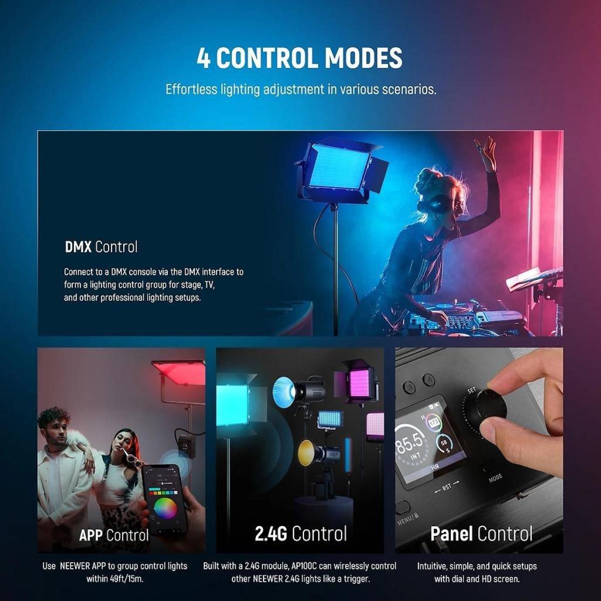 Das Neewer AP100C ist ein professionelles RGB LED-Panel mit einer Leistung 105 Watt und DMX Kompatibilität, welches bei einem Abstand von 0,5 Meter eine Helligkeit von 31.500 Lux aufweisen kann. Mit dem TLCI Wert von über 97 lässt sich die Videoleuchte auch in professionellen Produktionen verwenden, wobei die Bedienbarkeit über das integrierte TFT-Farbdisplay, die Neewer App, 2,4G Funk, den 5-Pin XLR DMX Effektweg möglich ist. Die Farbtemperatur liegt beim AP100C zwischen 2.500 K und 10.000K und die Helligkeit lässt sich zwischen 0% und 100% in 0,1% Schritten auf 4 Dimmkurven exponentiell, linear, logarithmisch oder in S-Form einstellen. Mit 18 Spezialeffekten, wie Kerzenlicht, Feuerwerk, oder Gewitter, ermöglicht das Licht außerdem maximale kreative Freiheit. Der ultraleise Lüfter bietet 4 Betriebsmodi, welche smart, medium, high und silent beinhalten. Die Stromversorgung erfolgt über das beiliegende Netzteil, oder auch per V-Mount Akku mit D-Tap Kabel.